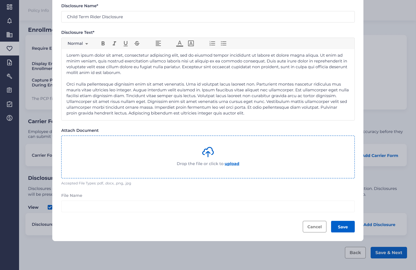 Some carriers/providers may have disclosures or specific plan language that they want presented to employees during enrollment. This could include pertinent information about the plan, any exclusions, etc.