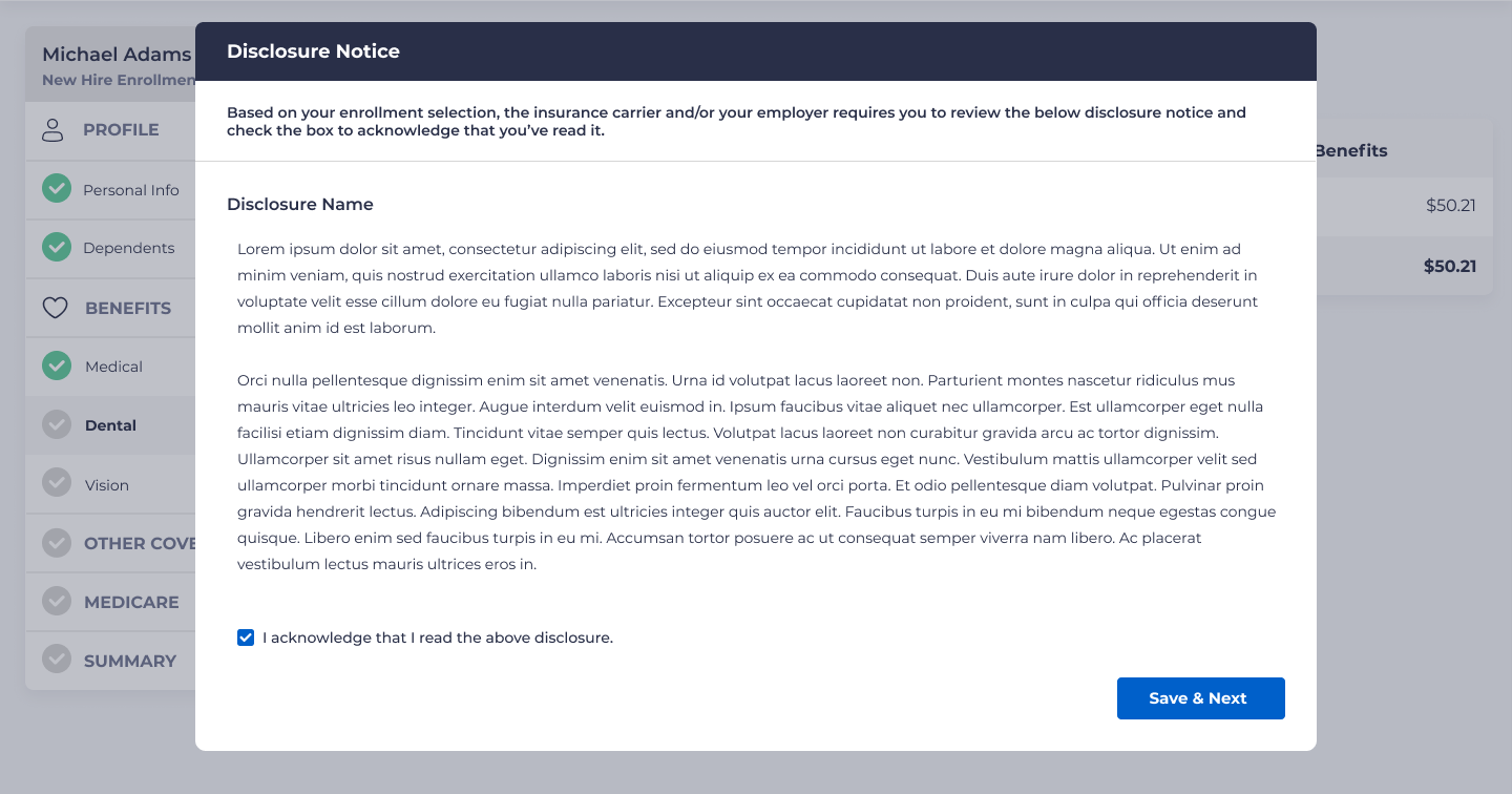 Upon enrolling in a plan, if there is a disclosure notice, the employee will see a screen that looks something like this: