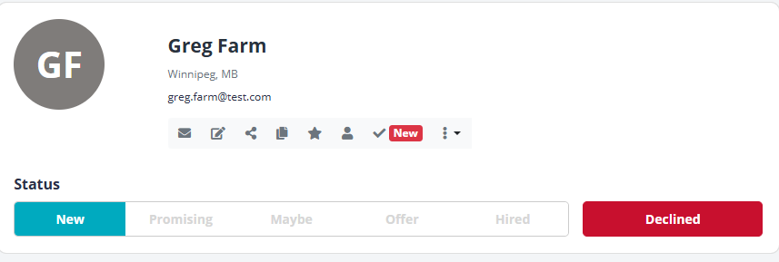 There are also a series of “Status” buttons, wherein you can identify the candidate as a new interview, whether they are promising, maybe, whether you wish to send them an offer, or if they have been hired.