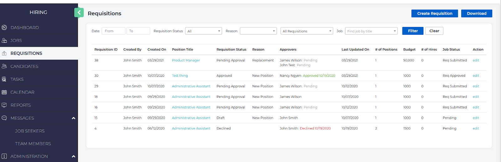 You may download a CSV file of all of the existing job requisitions by selecting the Download button on the upper right of the Requisitions page.