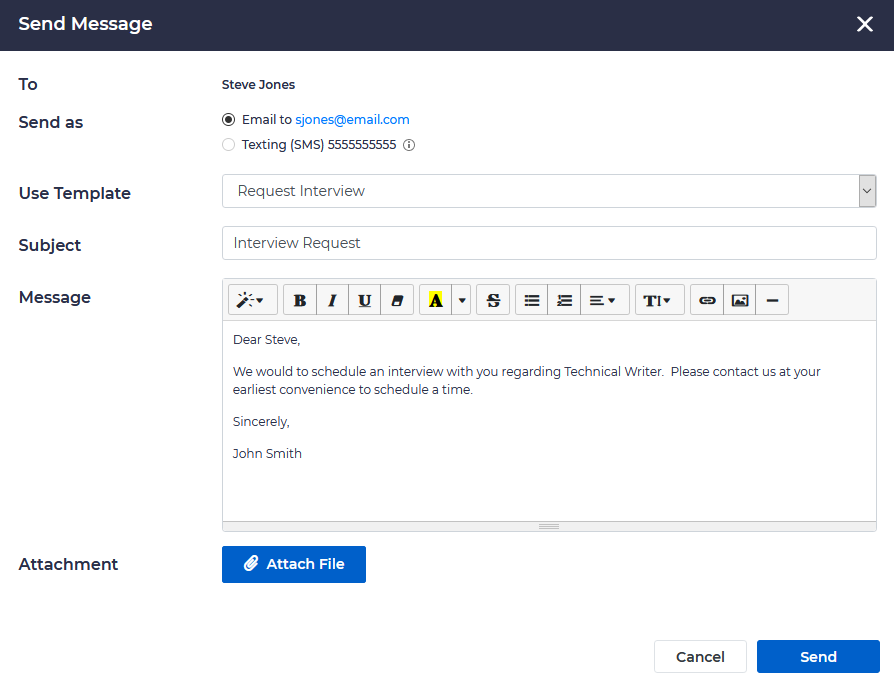 Here you may send the candidate an email or a text (if they have not enabled texting, this option will be disabled). You can either compose a message yourself, or use a preset email template.