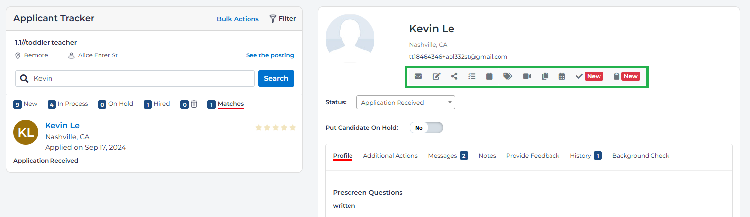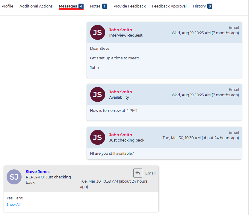 Messages – Here you can see a record of all communication with the candidate.