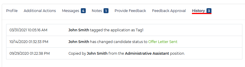 History – here you may see a history of all status changes or actions performed for this candidate