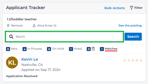 You may search for applicants with any status by entering part of an applicant's name into the search box and selecting Search just below the job title.