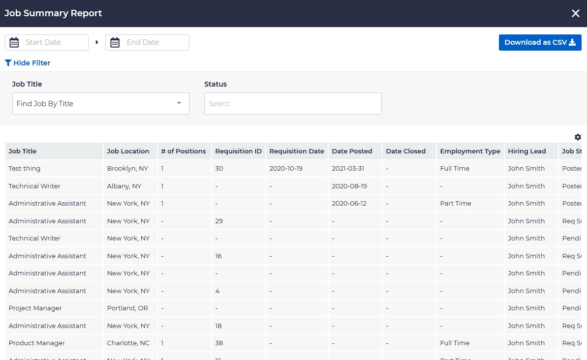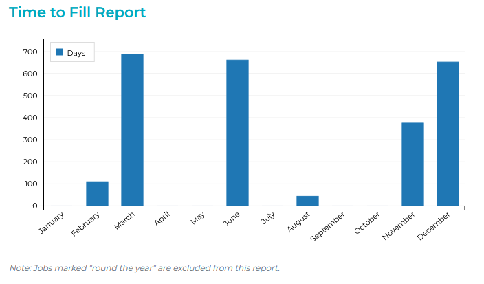 The time to fill report provides an analysis of how long it has taken to fill open positions. It is filterable by date, job title, and status, and includes the following data points: