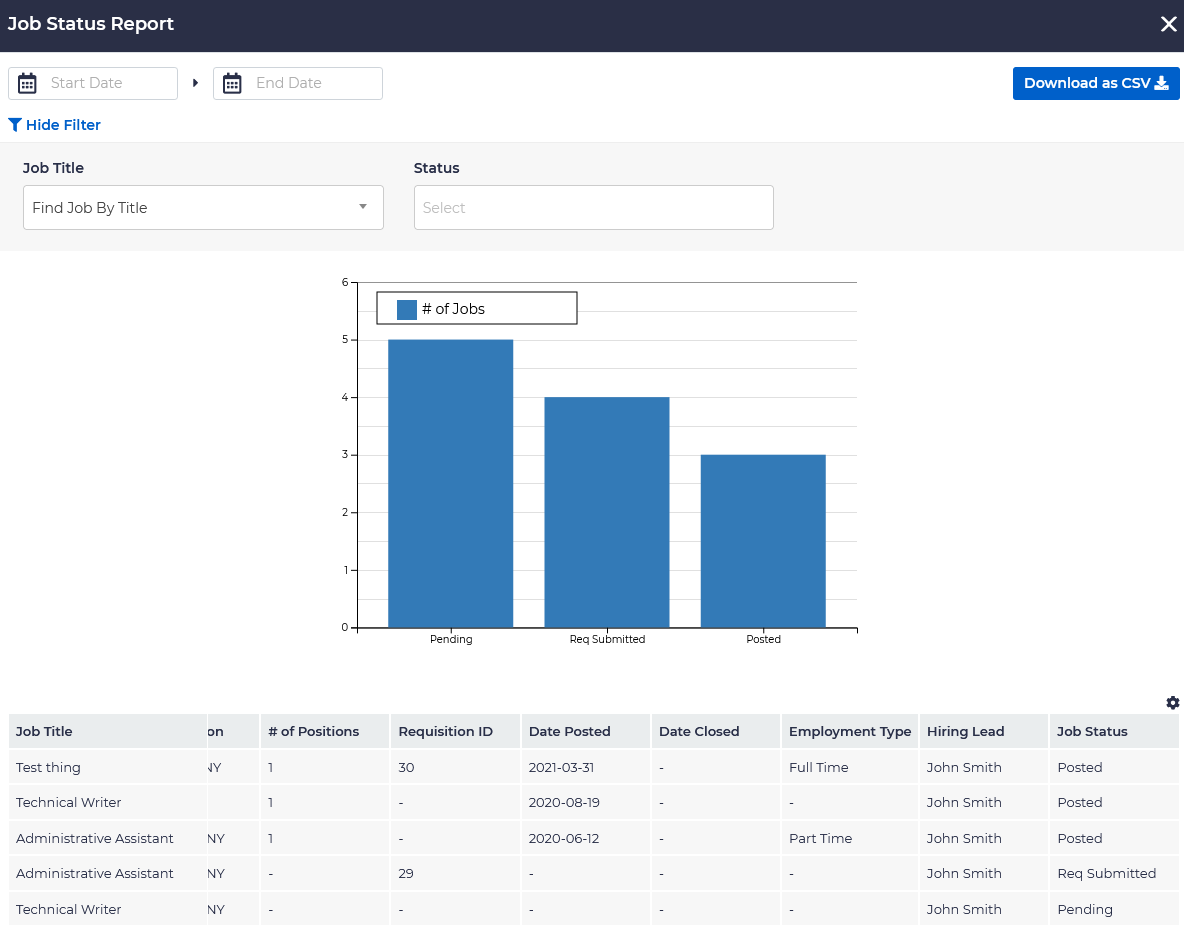 The Requisition Report includes data about job requisitions and displays a graphic of number of requisitions per status. It is filterable by date, job title, and status, and includes the following fields: