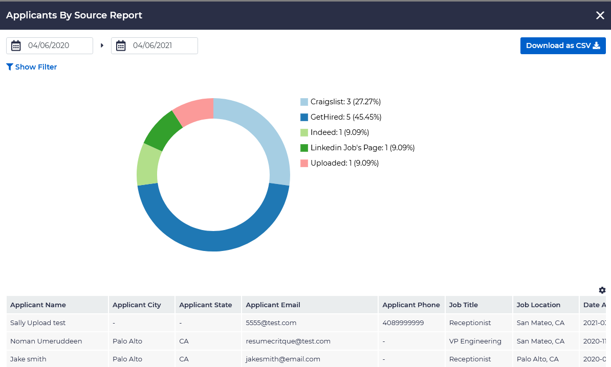 The applicants by source reports reveal the sources by which people have applied, such as which pages or job sites, where applications were made. This report can be filtered by date, job title, and source, and includes the following information: