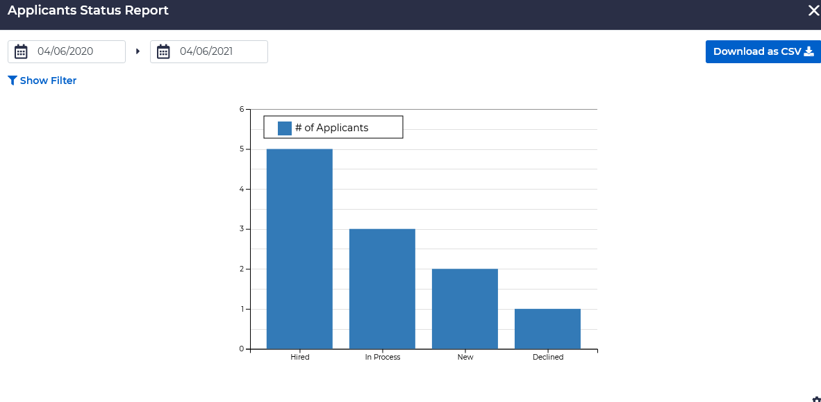 The Applicants Status report shows information about candidates, sorted by their workflow status. The graphic displays the number of applicants by status. This report is filterable by date, job title, and status, and includes the following information: