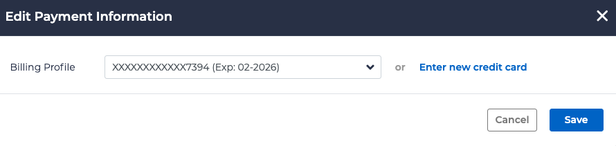 - Select the payment method to use, or click Enter new credit card to add a new payment method.