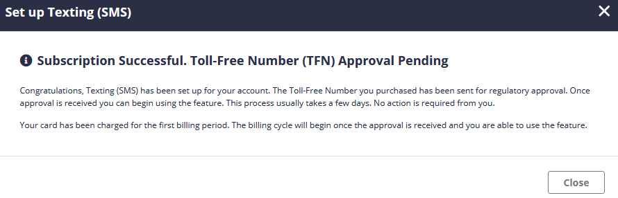 - After submitting your payment information you will see an approval pending screen. The toll free number you have purchased will be approved for regulatory approval.