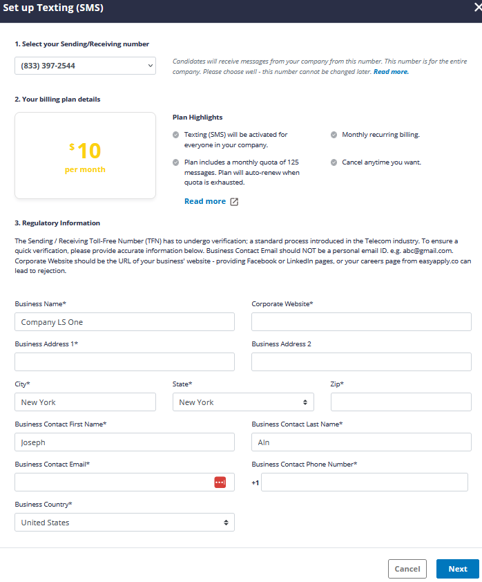 - Select your Sending/Receiving Number from the available dropdown. This is the phone number that will be used when sending and receiving SMS messages through ATS. Review the plan costs, and then select Next.