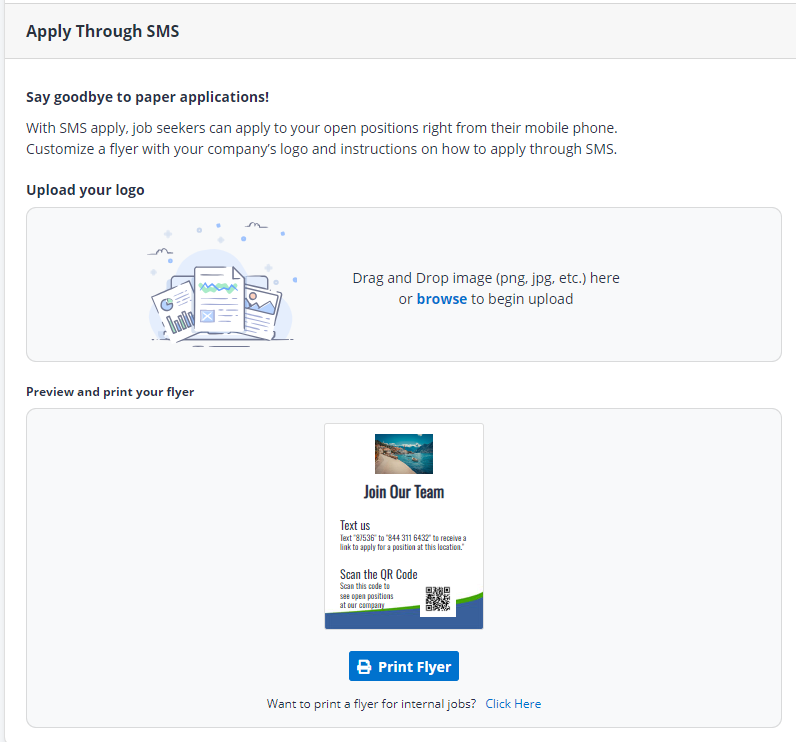 You also have the option of allowing applicants to apply directly to your open positions via SMS or text. You can print out a flyer which can be posted in public places. It includes a QR code which potential employees can scan with their mobile devices to take them directly to your custom career page.
