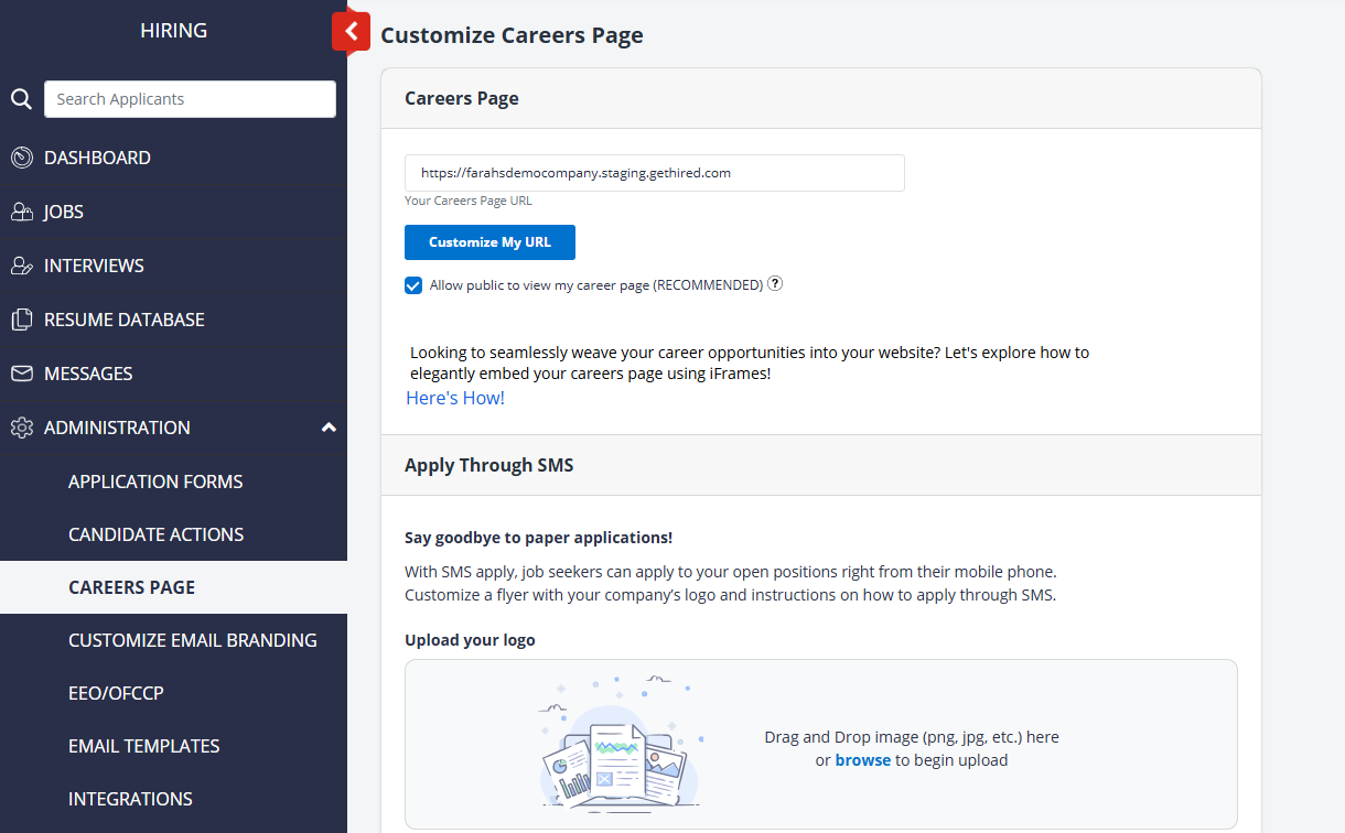 With your hiring account, you are provided a custom career page which will show all of your job listings in one convenient place that you can share. To manage this page, navigate to Administration - Careers Page from the left navigation menu.