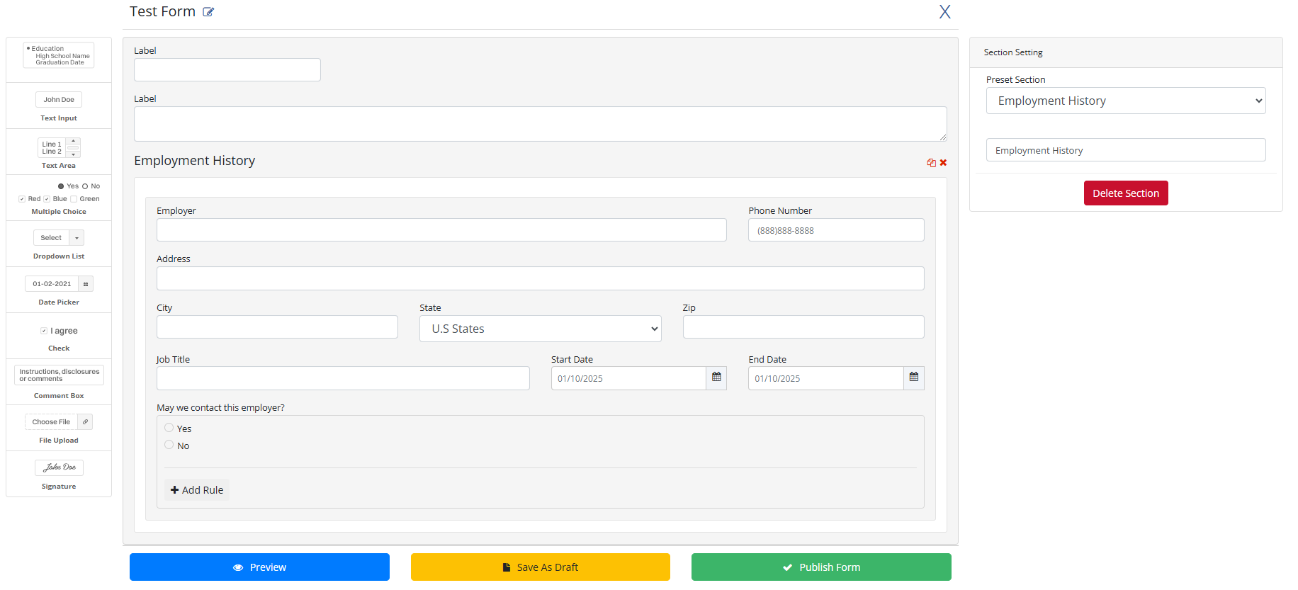 You can save your form as a draft and preview it by using the buttons on the bottom of the page.