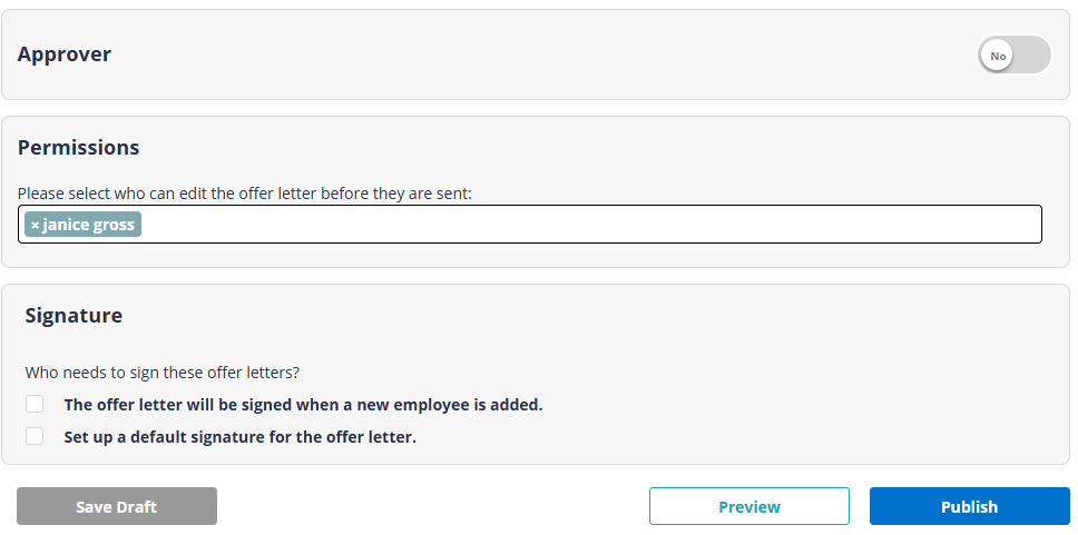 Indicate whether you need an approver for the letter prior to it being sent to new hires, set the permissions for who can edit the offer letter, and indicate who needs to sign the offer letters.
