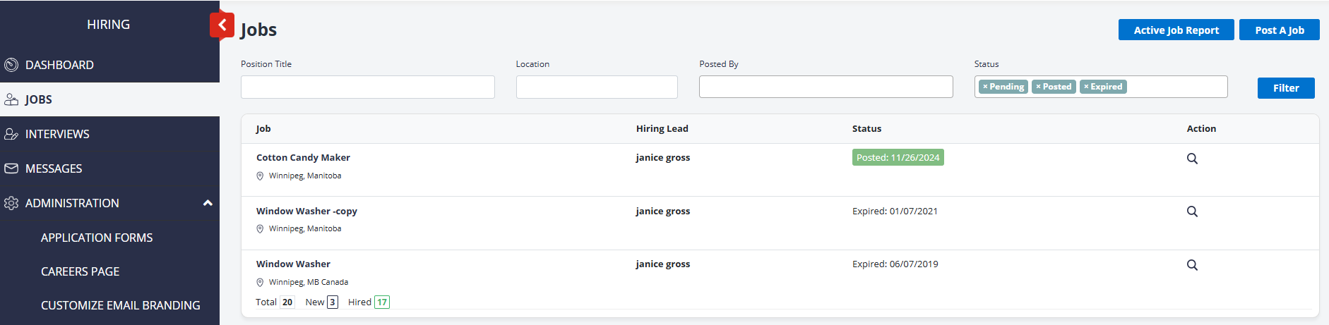 When you first log in to the Hiring Application, you will see the dashboard. If you are not already on this tab, select Hiring from the menu on the top of the page.