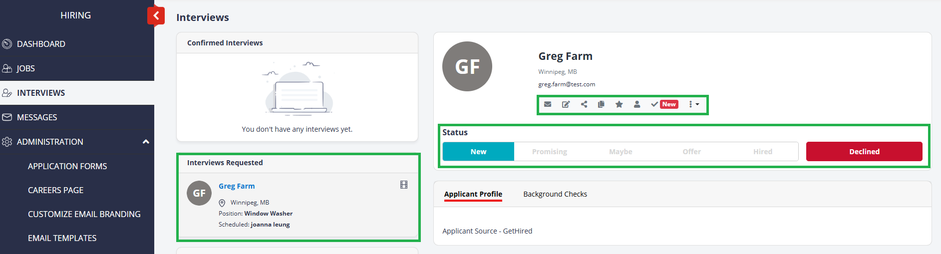 Complete all of the details, including multiple times for the applicant to choose from, and select Send Interview Request. This will send an email to the applicant.