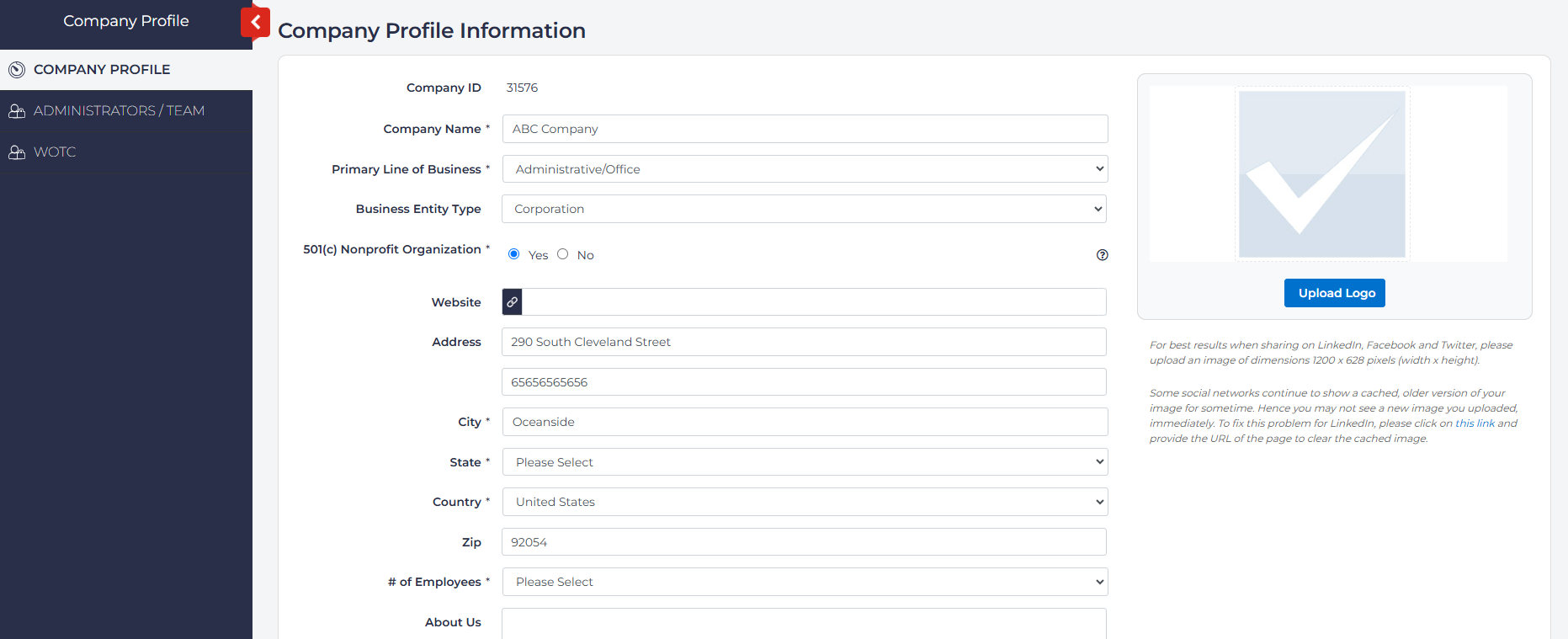 Upload your company logo by selecting the Upload Logo button on the right. Choose the image from your hard drive and select Open. Note, if you make a mistake, you can delete the image, by selecting the red trashcan icon on the lower right: