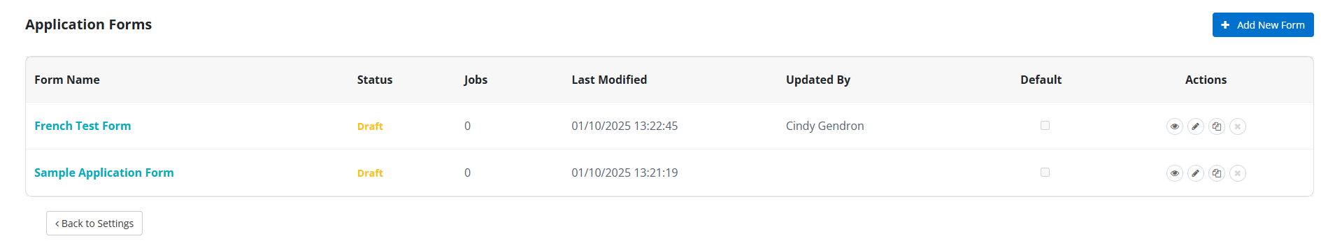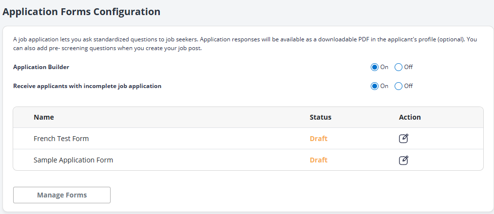 Alternately, you can create a new application form by selecting Manage Forms.
