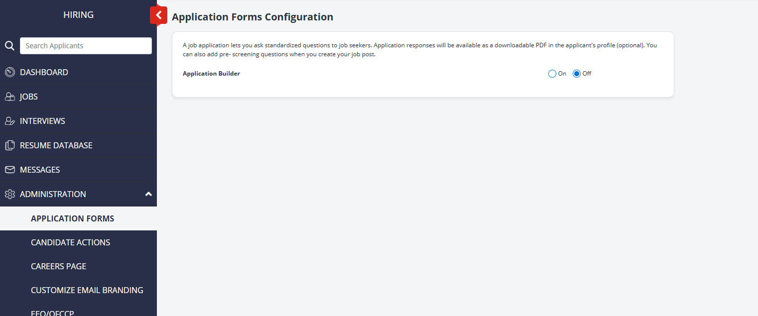 Next you will want to create one or more application forms to be used for job postings. Go back to the Hiring page, by select Hiring from the top menu, and then select Administration - Application Forms from the left menu.
