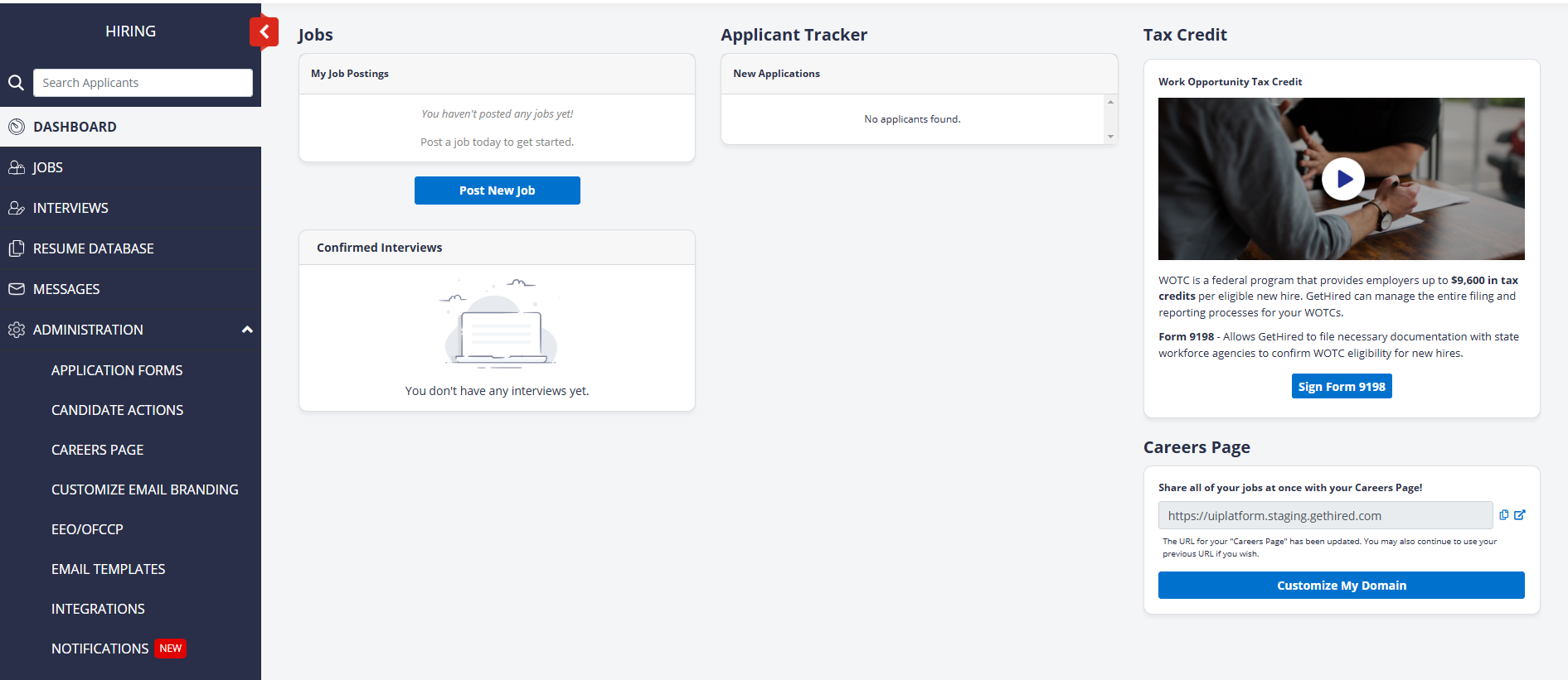 The first time you visit this page, you will see a screen with the following empty fields. Here is where you will eventually see your job postings, applicants, confirmed interviews, etc.