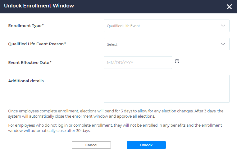 - To open the system for an employee to enroll or make election changes, click the Unlock Enrollment button and select the Enrollment Type.