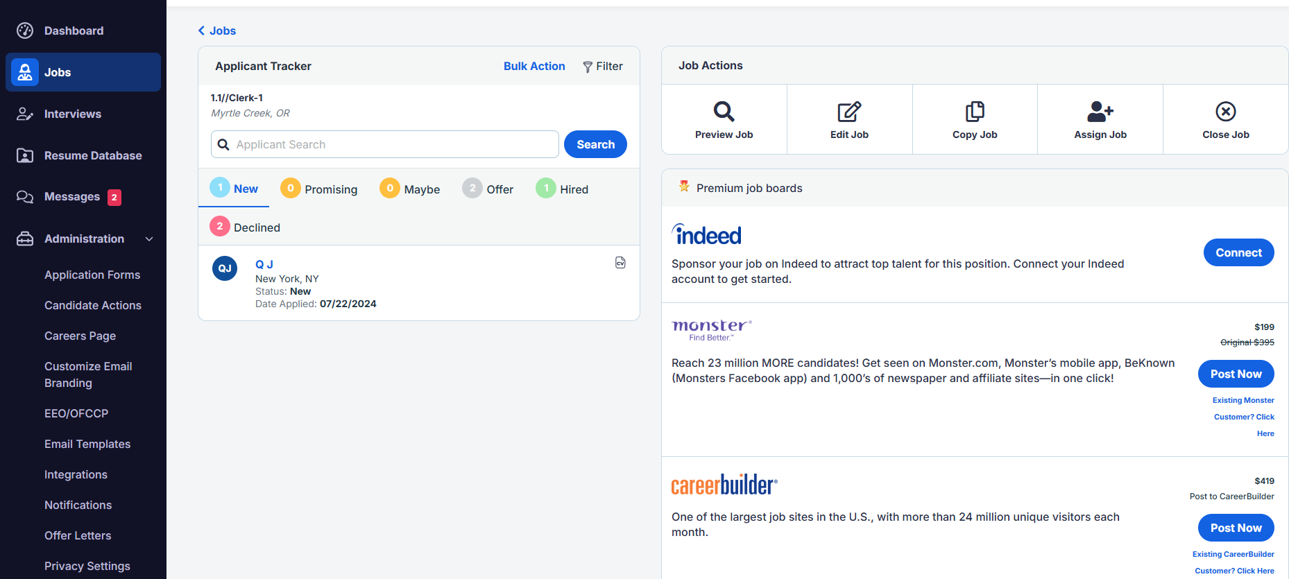 - Spread the word: Submits the Job to other platforms such as Craigslist, LinkIn, etc. You may also choose to purchase listings through Monster, CareerBuilder, JobTarget, and Indeed