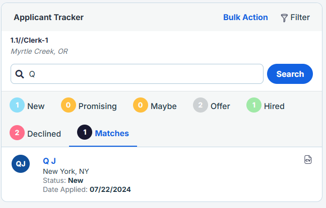You can also search for applicants in a long list, by entering part of their name into the provided search box and selecting the Search button. The results will appear in a new tab, labeled Matches.