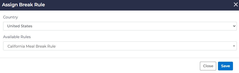 Assign a Meal Break Rule From Administration - Pay Rules & Codes Select Meal Break Rule at the top of the window. Select Assign Break Rule. Choose United States as the country and select a rule from the available rules. Select Save.