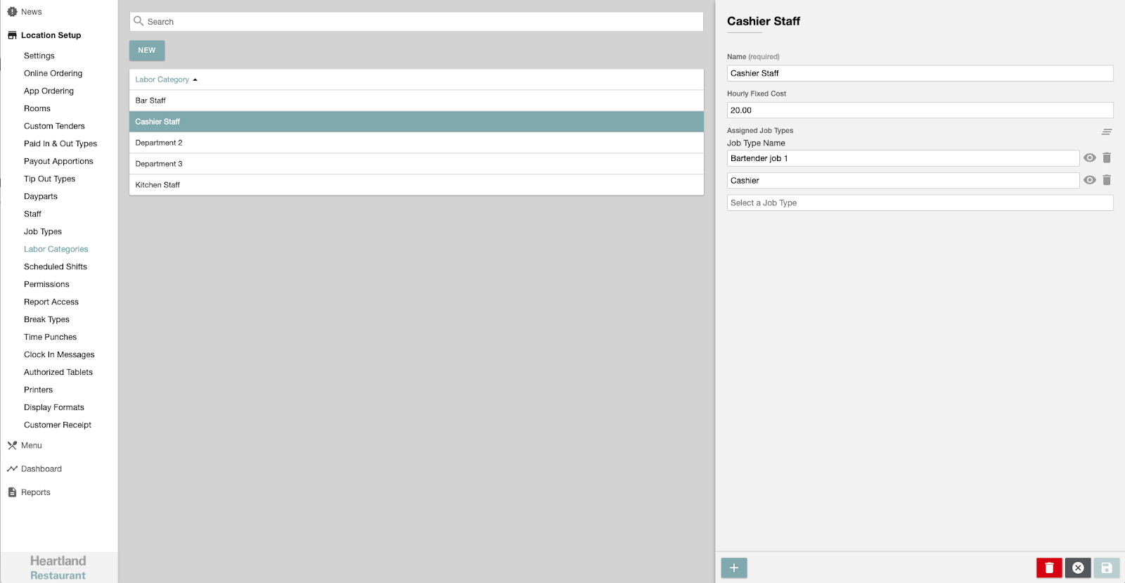 Jobs are organized in Heartland Restaurant through Labor Categories and Job Types.