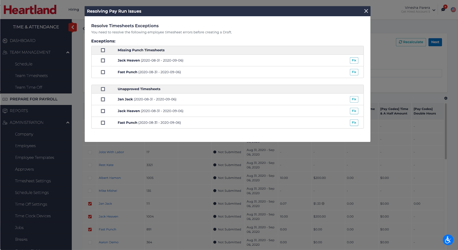 - Resolve any timesheet errors (missing punches, etc), then click Next.