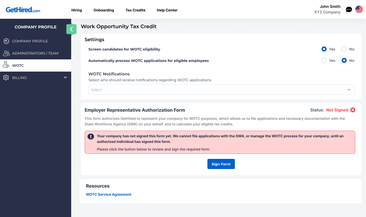 In addition to modifying your WOTC settings and notifications, you can also view copies of your signed ETA Form 9198 and the WOTC Service Agreement on the WOTC tab under your Company Profile.