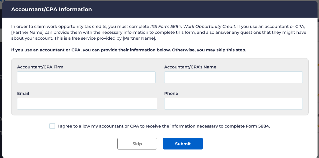 - The final step in the form signing process is to provide your company’s accountant/CPA information if you use one. This will allow us to provide them with the necessary information to complete IRS Form 5884, which is needed In order to claim work opportunity tax credits. If you don’t use an accountant or CPA, you can skip this step.