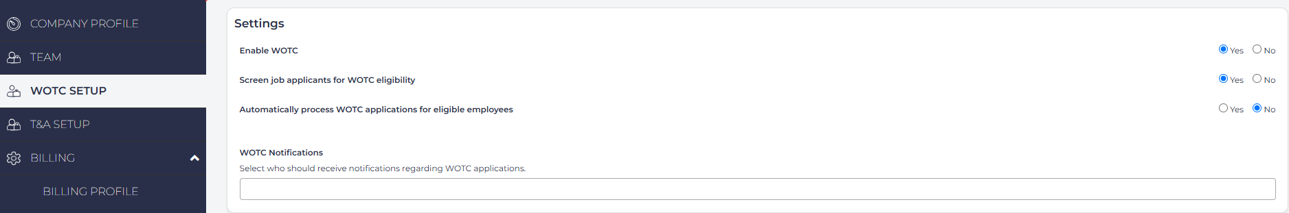 If you wish to enable WOTC screening, this setting must be set to Yes before any WOTC orders can be submitted.