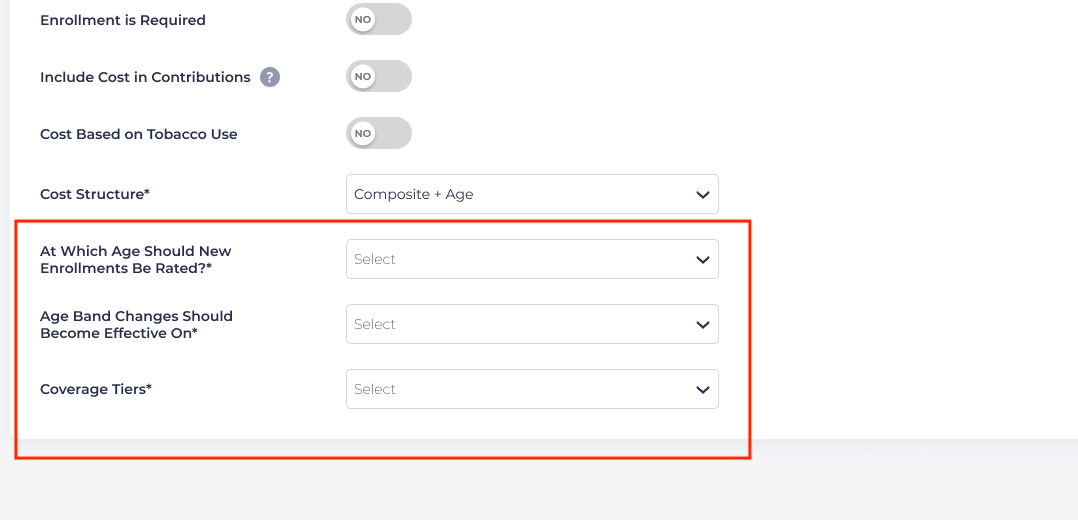 For Life/Disability plans, if the plan does have age-based rates and Issue Age is set to Yes, then the Age Band Changes Should Become Effective On field will be replaced with a toggle field for Re-Rate Rider Cost When Coverage Increases Occur