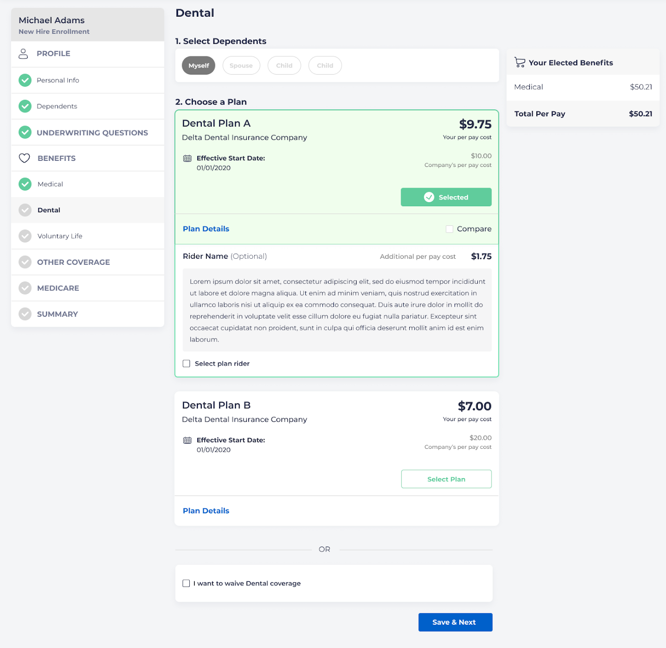If a plan has a rider attached, employees will see it on the enrollment screen as shown, and they will be able to select the rider in addition to its associated plan.