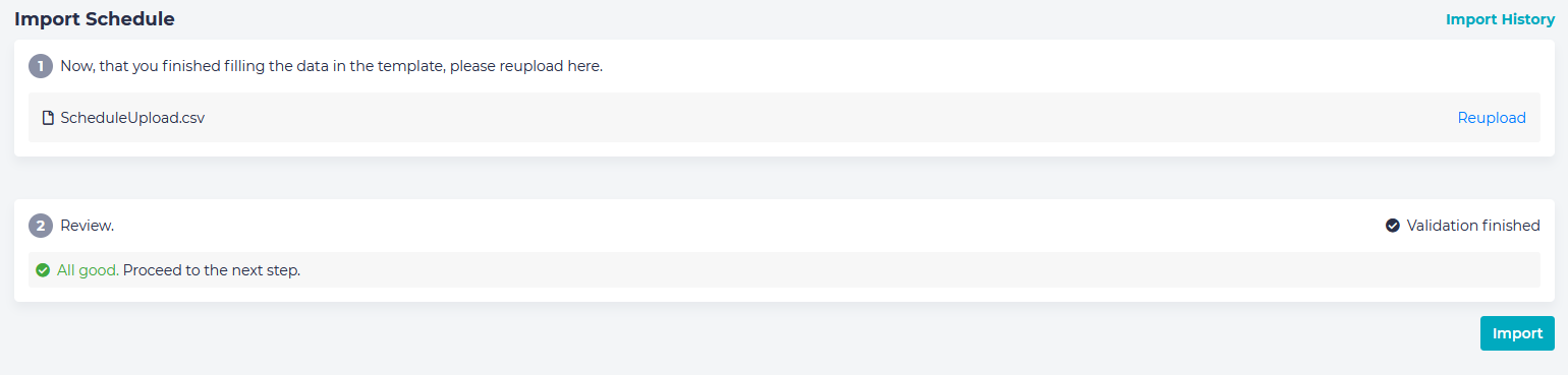 On this page you may upload your schedule in CSV format, either by dragging the CSV onto the screen or by clicking “browse” and locating the file on your computer