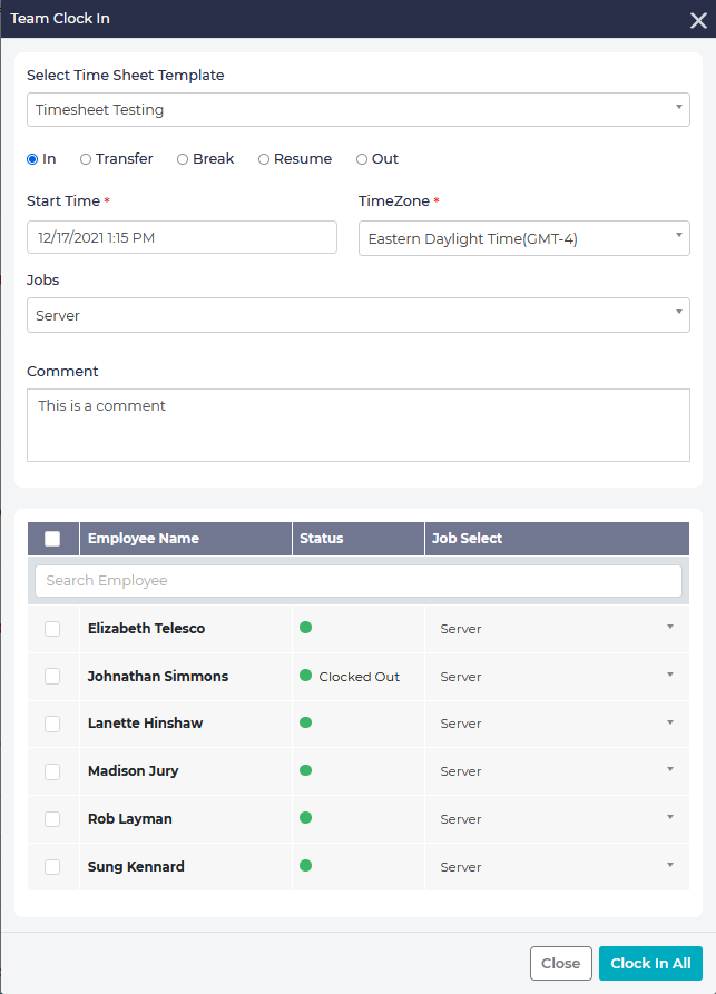 Choose whether you are clocking your team in, transferring them, setting a break, resuming after a break, or clocking them out.