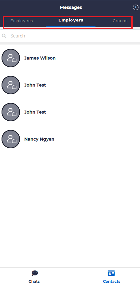 You can choose a new individual contact, by clicking on the “Contacts” icon on the lower right of the screen. ON the screen that comes up there are three tabs: Employees, Employers, and Groups. Here you may find the respective people whom you may wish to message.